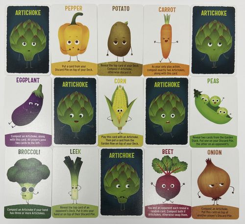 “Filler” is a term used by gamers to describe those games you can play when a) you and your friends are waiting for the rest of the crew to show up, b) there are two games being played on separate tables, one finishes earlier than the other and wants something to do, and c) you otherwise have 15 minutes or so to kill. For such situations, it’s great to have Abandon All Artichokes (Gamewright) in your game arsenal. This cutesy card game has a simple goal: Deal yourself a hand of five cards, none of which feature the titular veggie. Problem is, you start with nothing but 10 artichokes in your deck. So, on your turn you add one other veggie from a tableaux into your hand to give you actions to help you compost the unwanted produce.