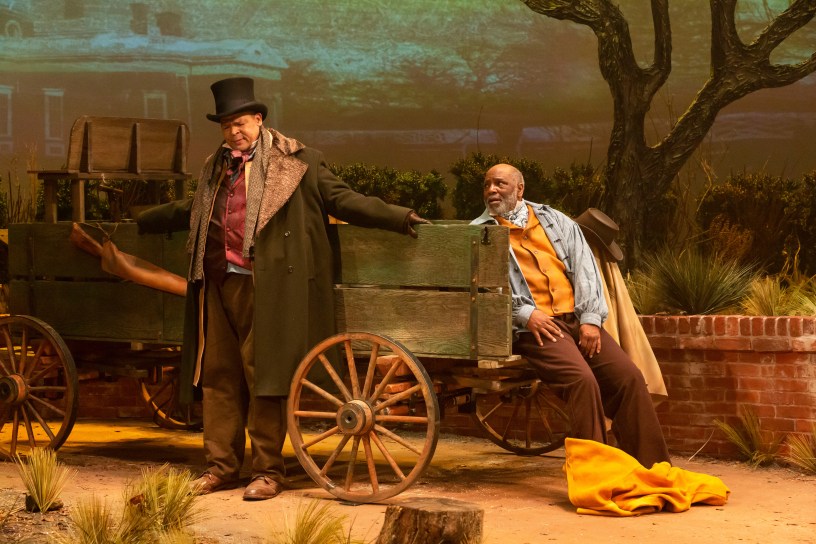 – With a hefty dose of backstory, the I’m leaving/I’m not leaving challenges that face any two-hander, and an abundance of symbolism — some overt and even acknowledged (including an actual stubborn mule) — it wasn’t clear what the stakes and obstacles were for each of these men. The details were there, but not the focus. And that would be a bigger problem if the moment-to-moment writing wasn’t so strong. Whether focused on how to cook a rabbit or sharing memories of relatives lost, dead, or sold, Smith’s play was strongest in its details more than its arc.
