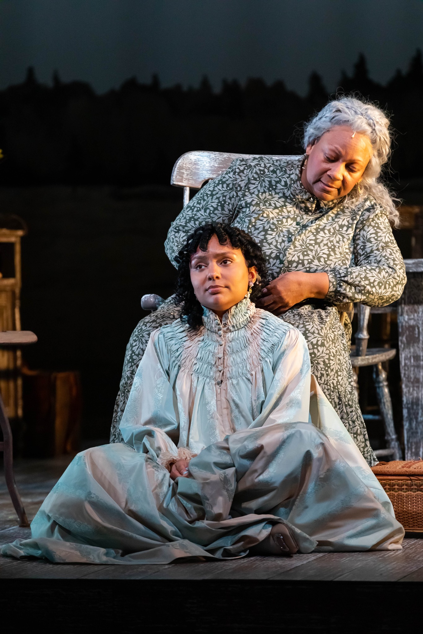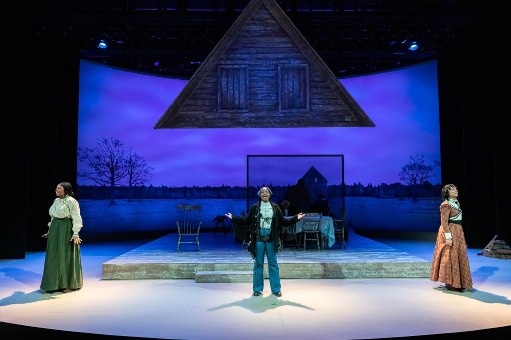 I’m not convinced, though, that the production found the rhythm to maximize its impact. It opens with some brief live banjo playing and an explainer narrative that seems tacked on, as if the audience couldn’t be trusted to pick up the plot from context clues in the early scenes. Even when not breaking the fourth wall, characters often seem to be focused on the audience rather than each other. Clearly, that’s a directorial choice and while, for some, it may provide connectivity, for me it added a level of artificiality that hurt the piece. The fluidity isn’t helped by the set, whose time-consuming revolve adds disruptive pauses. Nor by music that distracts rather than accentuates.