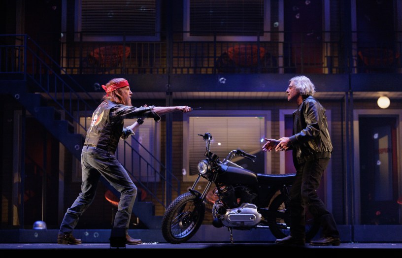 What was missing for me was the urgency of the narrative (moving a motel does tend to slow things down) and the gravitas of the story itself. There’s not a kingdom at stake, just a subculture with little impact outside its own bubble. The leads — aided considerably by the costume and hair crew — create memorable individuals. They have the walk, the talk and the attitudes down pat. Yet it never feels like the ambition of Tom McCamus’ Macbeth is driving him to his fate. He just seems to be along for the ride until he goes too far. An arc also seems missing from Lady Macbeth in spite of Stratford stalwart Lucy Peacock’s immersion in the character (Did anyone else sense a hint of Patti Scialfa?).